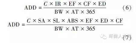 參考土壤重金屬評價模型,本研究設(shè)定2種暴露途徑:①通過手-口直接攝入;②通過皮膚接觸攝入.其中,手-口攝食途徑和皮膚接觸途徑下的攝入量(AOD)計算公式分別如式(6)和(7)所示.
